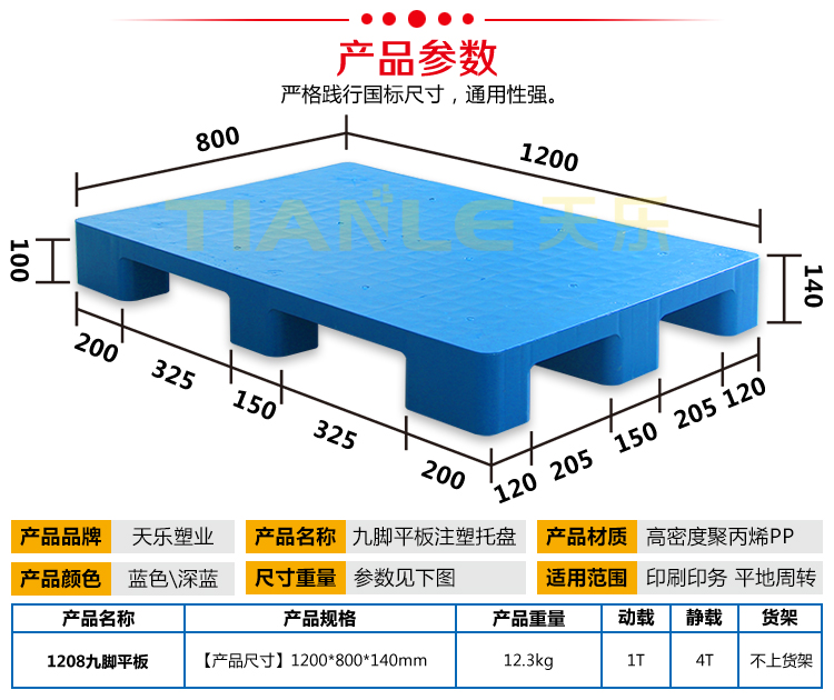 九腳塑料托盤,即根據(jù)塑料托盤的外形而言的,此類型的塑料托盤底部為九腳型,因而得名九腳塑料托盤。此類一般承載都比較輕,不適合于上貨架或者轉載大重量的貨物,九腳托盤一般都作為倉庫輕型貨物墊倉板,叉車周轉較輕貨物使用。此類托盤表面形狀有:平面與網(wǎng)格之分。